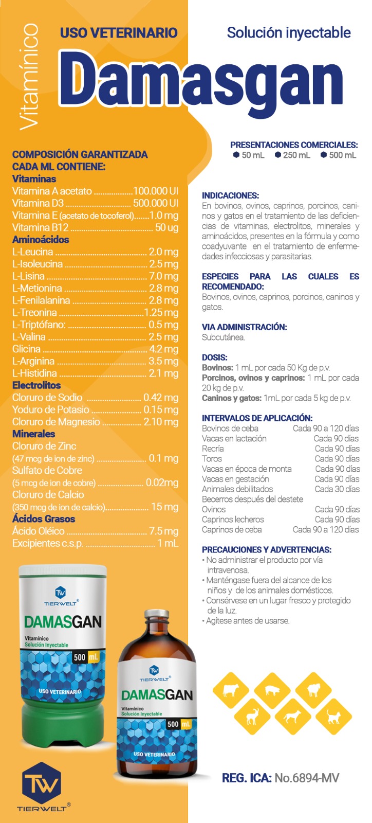 En bovinos, ovinos, caprinos, porcinos, caninos y gatos en el tratamiento de las deficiencias de vitaminas, electrolitos, minerales y aminoácidos, presentes en la fórmula y como coadyuvante en el tratamiento de enfermedades infecciosas y parasitarias.