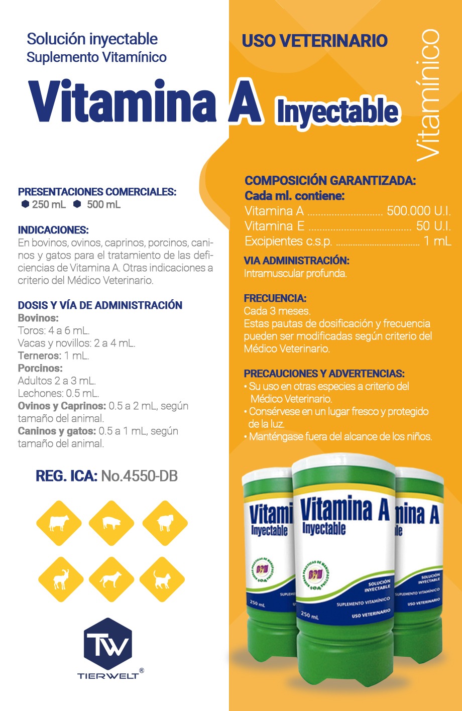 En bovinos, ovinos, caprinos, porcinos, caninos y gatos para el tratamiento de las deficiencias de Vitamina A. Otras indicaciones a criterio del Médico Veterinario.